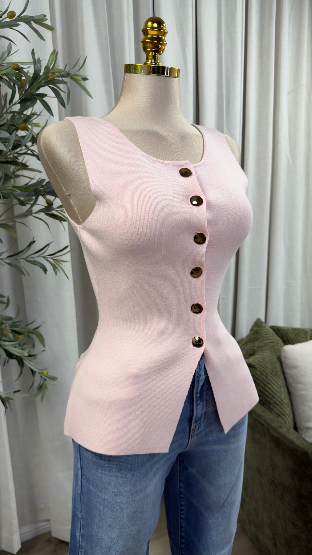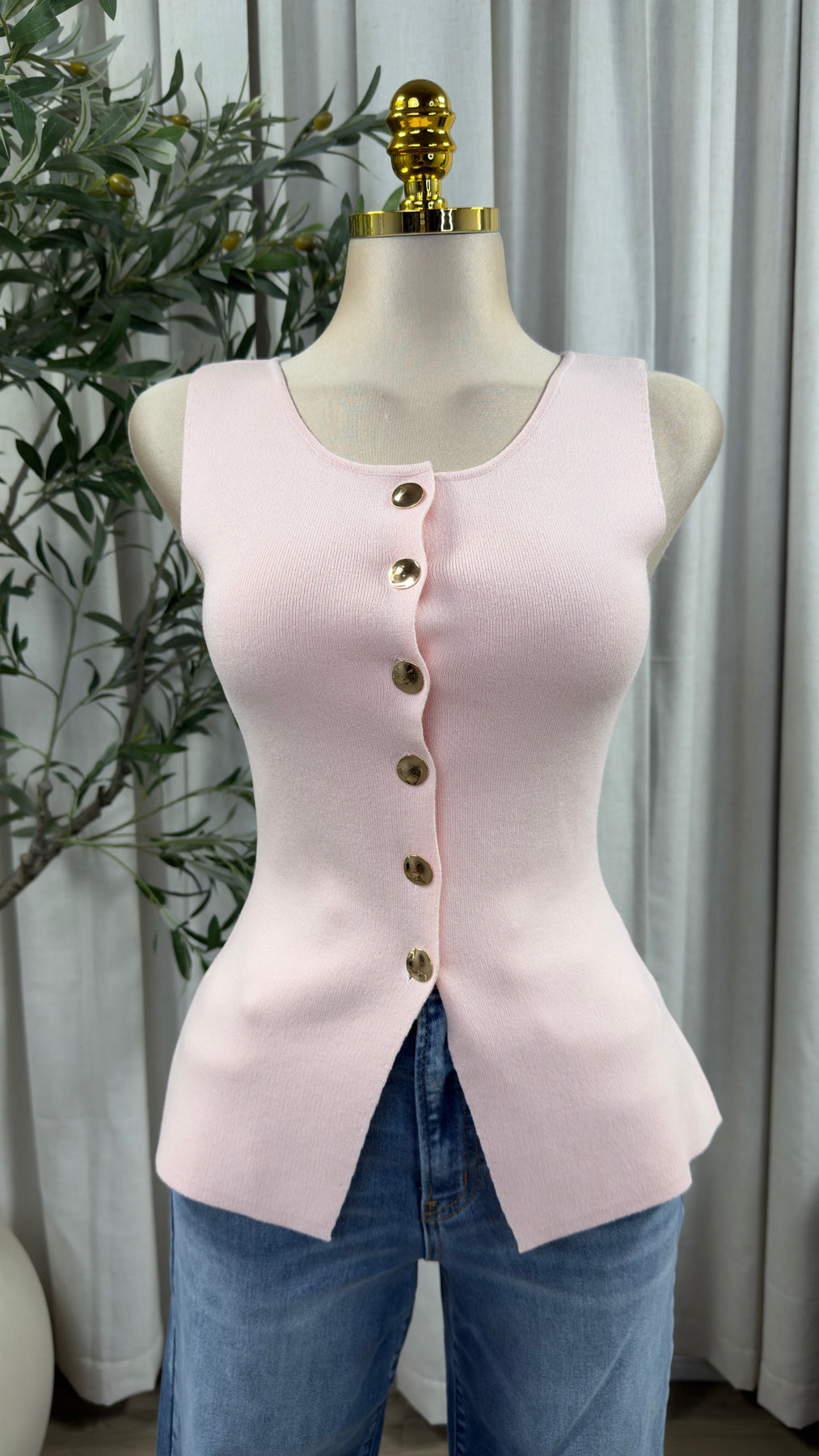 Knitted Vest Blouse w/ Front Slit & Gold Buttons