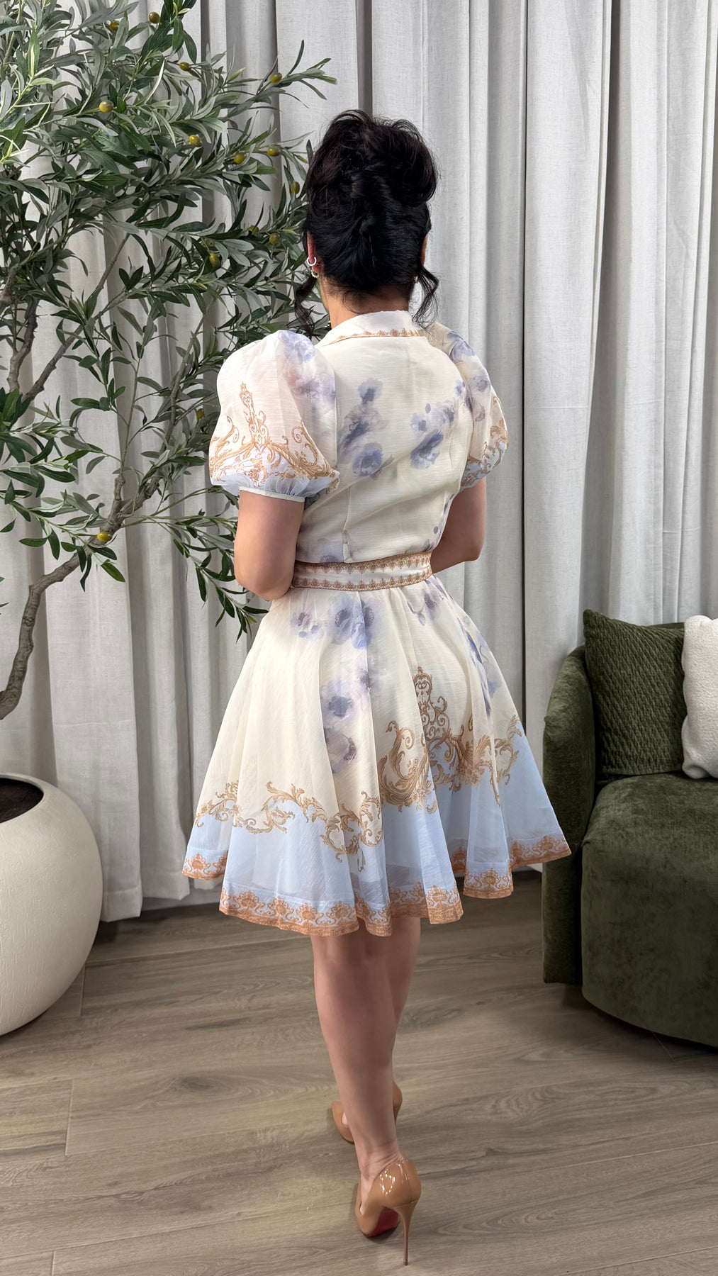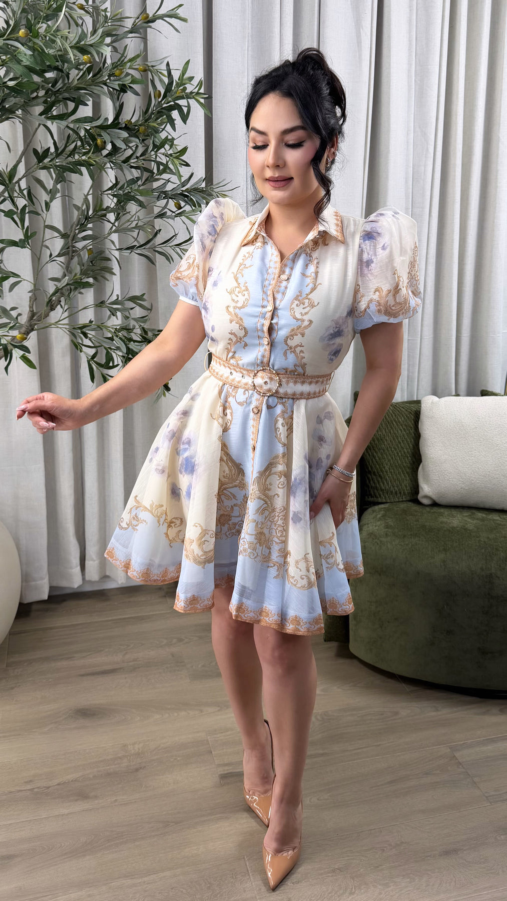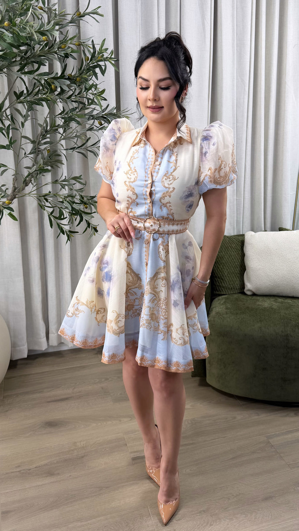 SHORT SLEEVE BUTTON DOWN BELTED MINI DRESS BABY BLUE/IVORY PRINTED. No stretch. True to size.