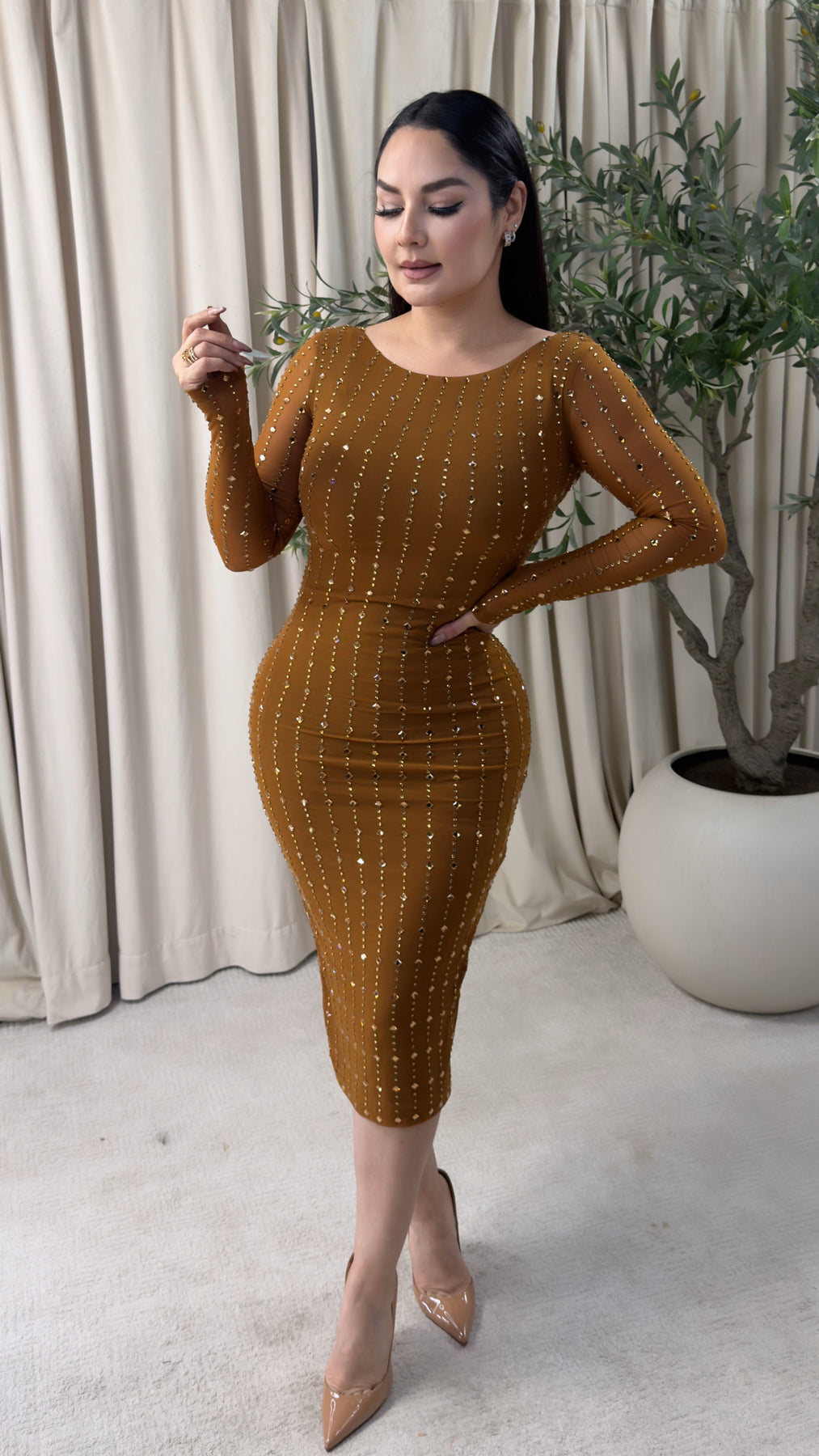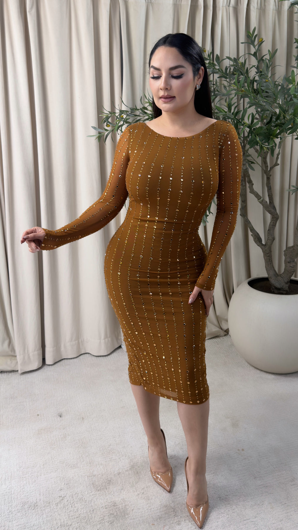Long Sleeve Full Square Rhinestone mesh midi dress w/ boat neck and low back