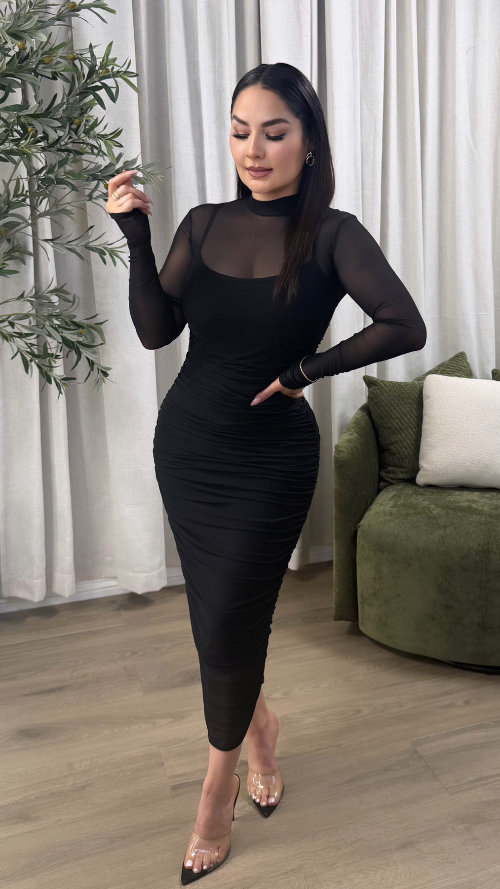 Long sleeve  mesh mock neck midi dress. Great stretch. Amazing fit. Zipper on back.