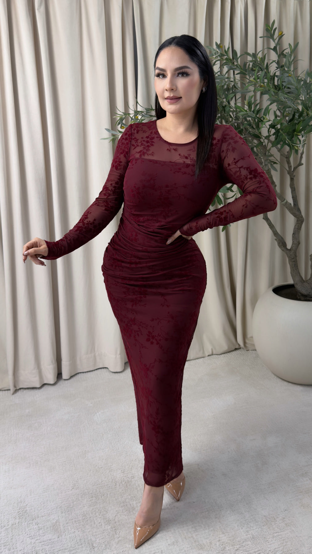 long sleeve flocked mesh ruched dress