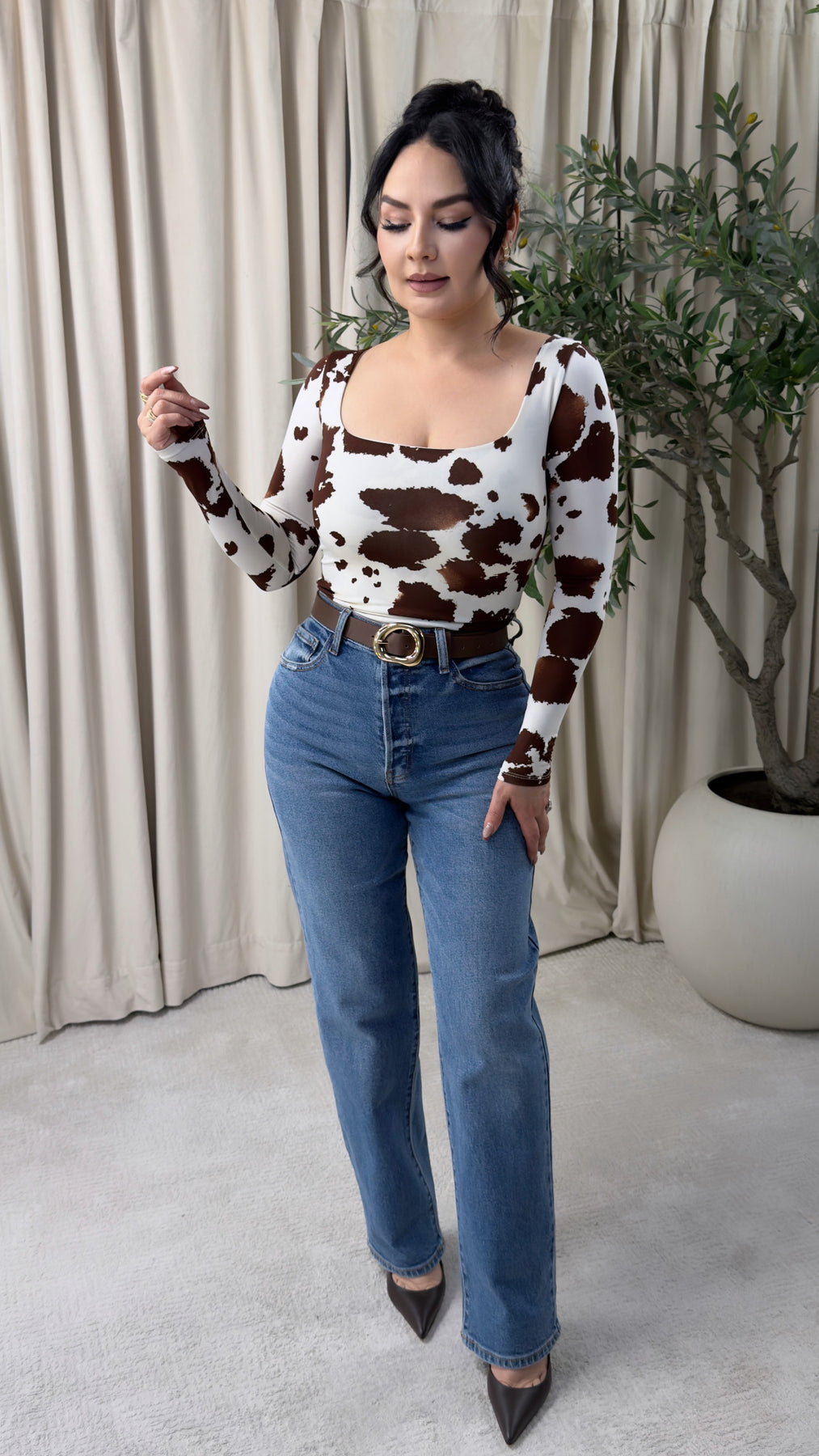 Long sleeve square neck double layered top . cow print